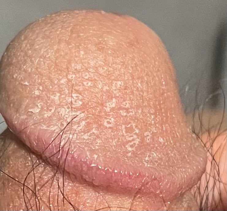 귀두 부위에 각질이 일어난 것 마냥 생긴 소견으로 일반적으로 헤르페스를 의심하여야 하는 수포성 병변이 보이지 않고, HPV를 의심할만한 곤지름 양상의 병변이 보이지 않습니다. 그렇지만 귀두염의 가능성을 고려해볼 수 있으며 곰팡이 감염으로 인한 증상일 수도 있겠습니다. 정확한 감별을 위해서는 실질적으로 진료 및 검사를 받아보시는 것이 필요할 것으로 사료됩니다.