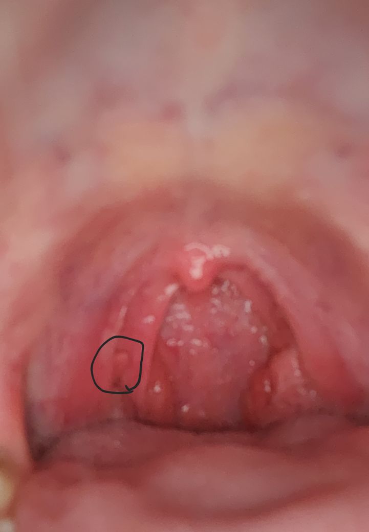 사진이 흐려서 명확하지는 않지만 편도가 오른쪽이 상대적으로 작은 것 같고 튀어나온 부분은 편도라고 생각됩니다.