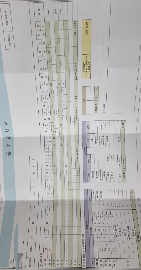 3조2교대 주간8시30분~21시30분 야간 21시30~8시30분까지 근무하고 있는데 급여명세서 확인좀 부탁드려요~ 제가 공장일은 처음이라ㅜㅜ