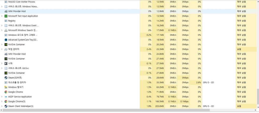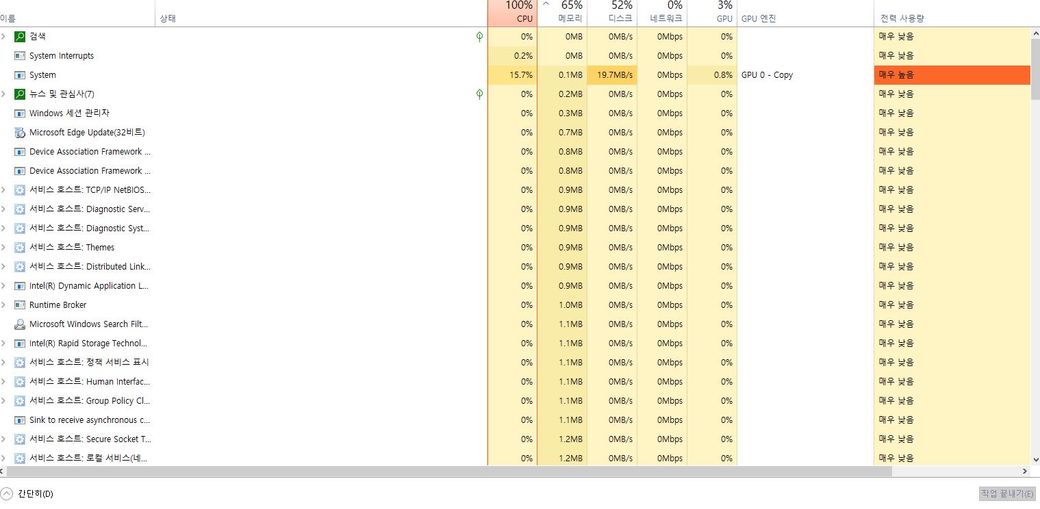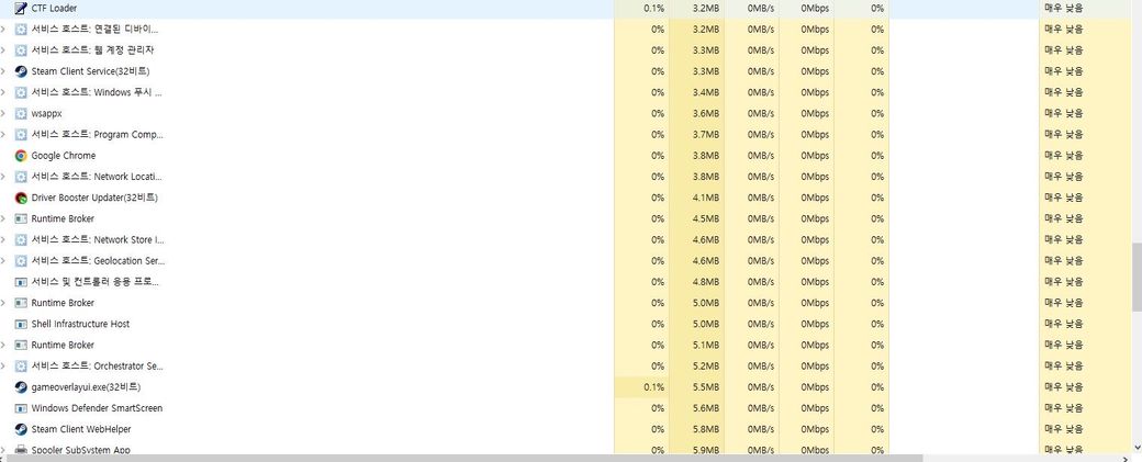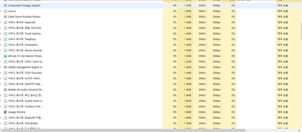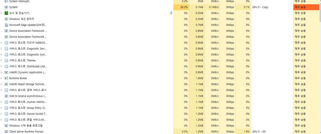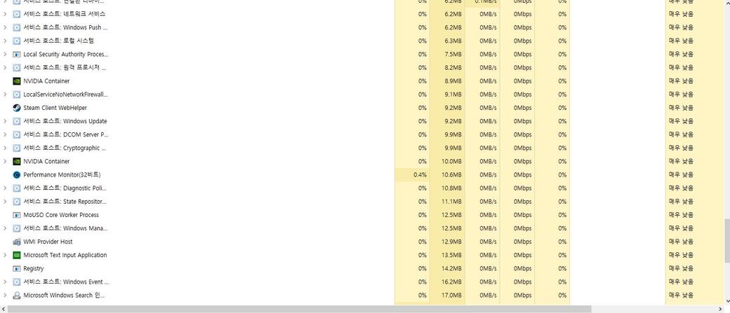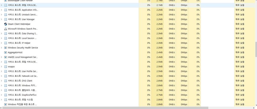 윈도우 10 6월달 업뎃 이후 게임 도중 작업 관리자를 켜 확인해 보니 서비스 호스트가 이렇게나 잇던데 … 이게 갑자기 게임 내 한 번씩 렉이나 입력 끊김 버벅임의 cpu 과부하 될 수 잇을 만한 양인가요?