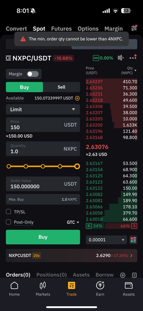 마찬가지로 해외거래소도 최소 주문금액이 존재하며, 바이비트의 경우 10USDT이므로 4NXPC의 가격이 그에 미치지 못하기 때문이거나, 아니면 첨부하신 화면을 보았을 때 Price에 주문금액인 150UDST를 적은 것이 아니라 NXPC의 가격 2.63XXX의 가격을 기입해야 제대로 주문이 될 것입니다.