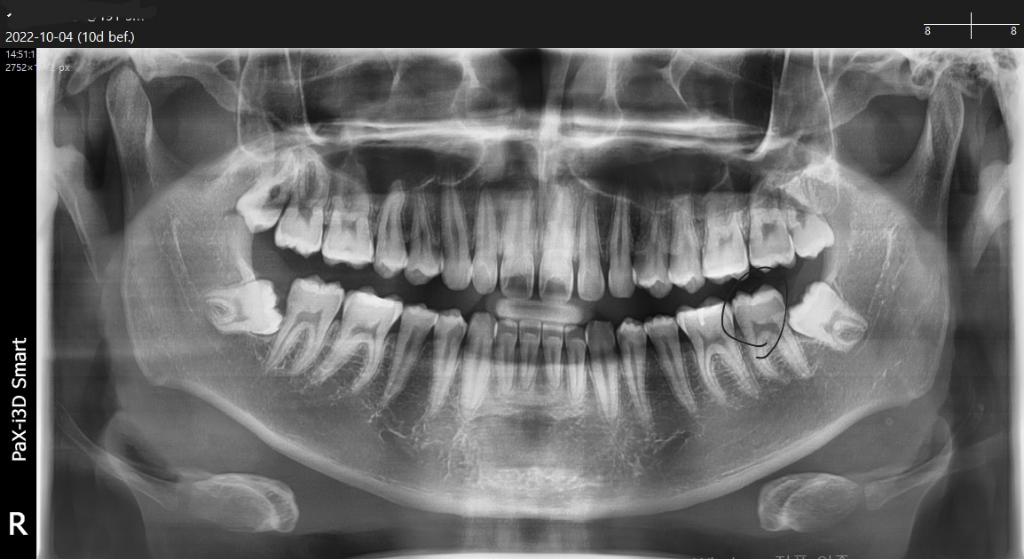 파노라마 사진으로는 정확한 진단이 어렵고 치근단사진이 필요합니다. 증상은 크랙의 증상에 가깝습니다