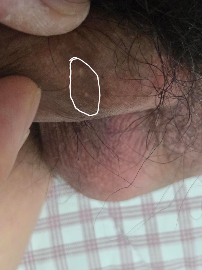 음경의 밑 부분 사진인데 하얀색으로 동그라미 친 부분이고 특별히 아프거나 하지는 않습니다 성관계를 한 적은 없는데 포비아가 생겨서 궁금증에 물어봅니다