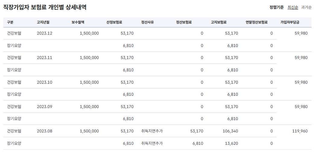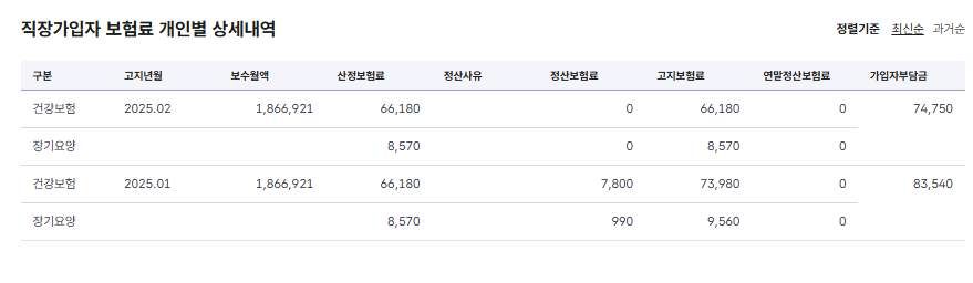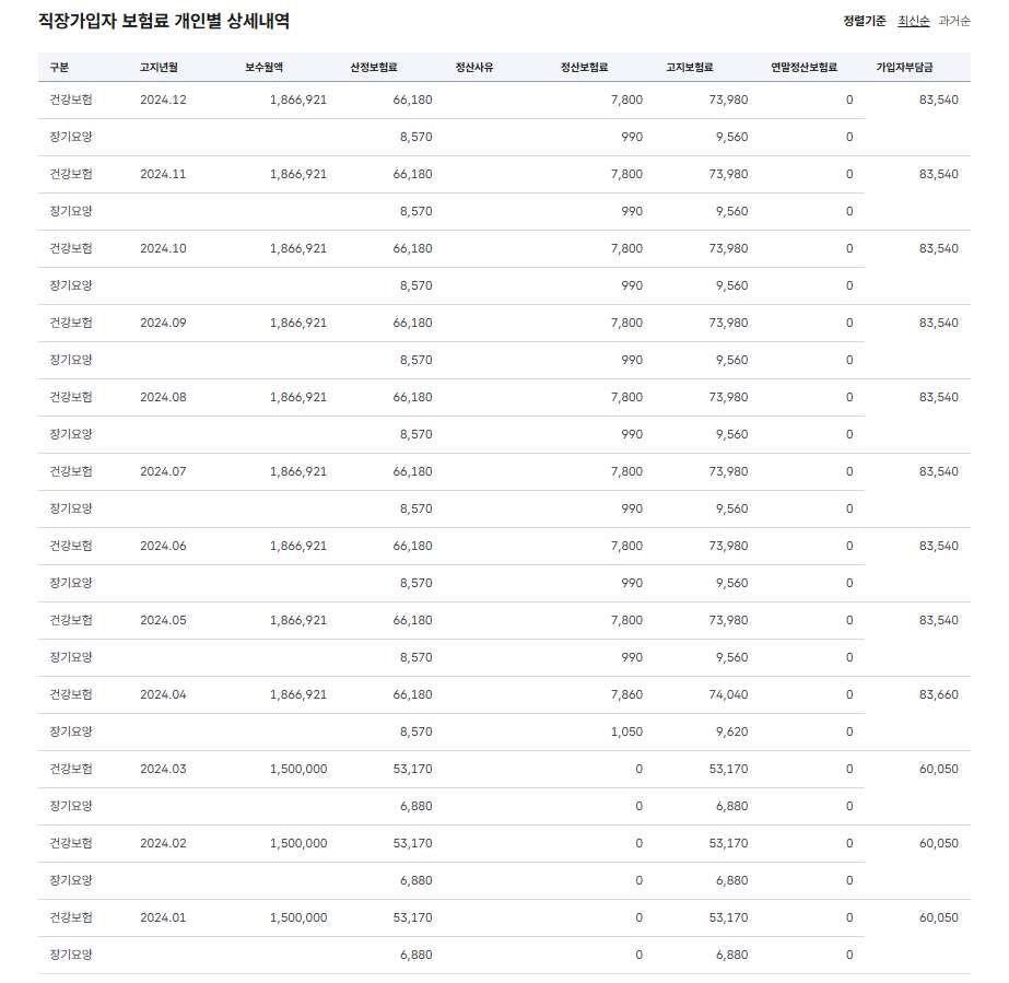 3번과 이어지는 얘기로 4대보험 납부내역을 찬찬히 확인해보니 저의 보수월액이 이상하게 계산되어 있었습니다. 이는 어떤 상황일까요. 저는 매월 월급을 다른 금액으로 받았으나 23년 08월부터 24년 03월까지는 1,500,000원으로, 24년 04월 부터 25년 02월까지는 1,866,921이 보수 월액으로 책정되어 있었습니다.