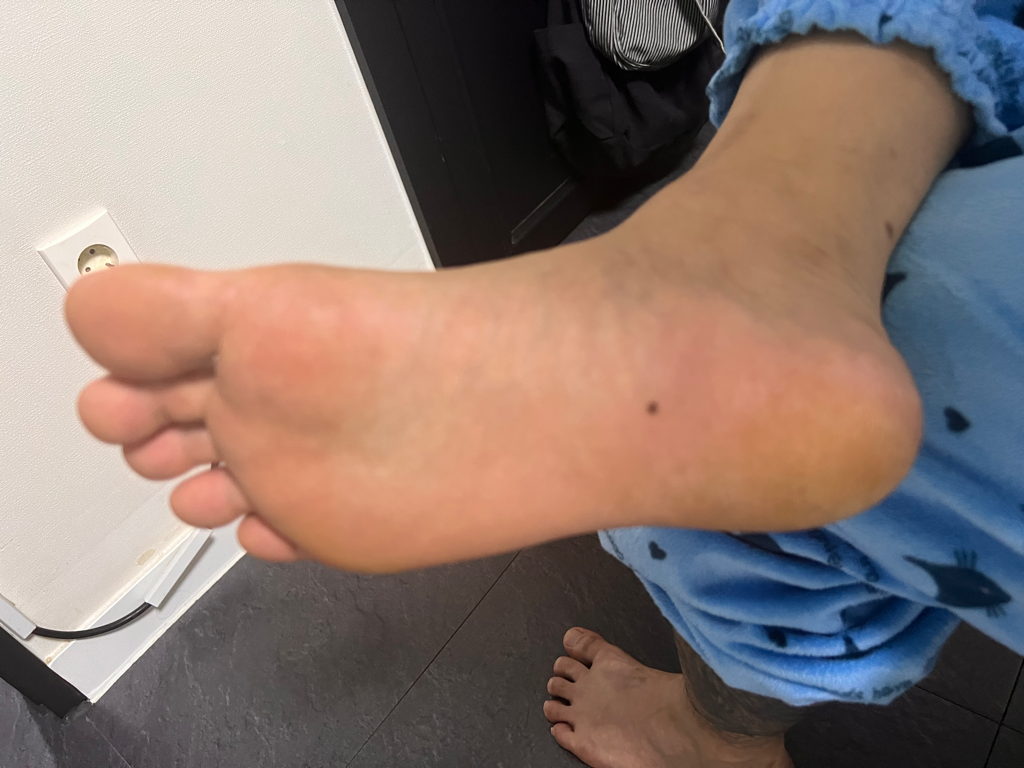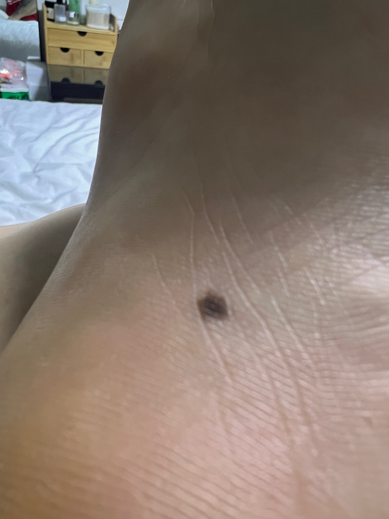 경계가 명확한 편이고 모양이 균일하다 보여지는 모반입니다. 가능성이 낮을 것이라 예상되나 피부과 전문의를 찾아가보시는 것이 가장 정확합니다.
