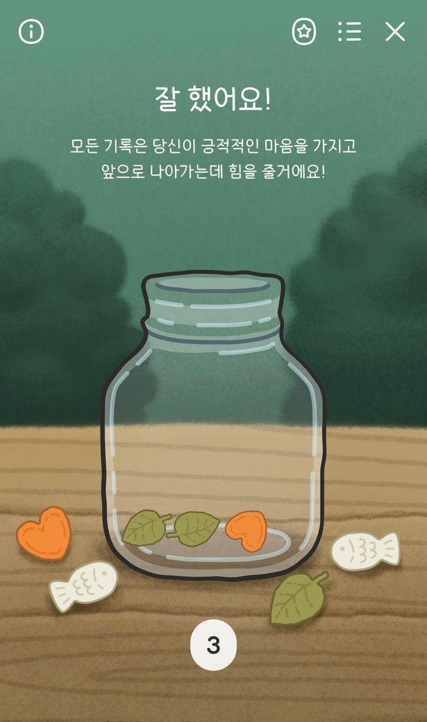 대표적으로 DailyBean은 하루 감정을 색과 아이콘으로 기록해 누적되는 방식이라 직관적이고 가볍습니다. Moodistory는 감정을 시간 흐름에 따라 정리해주고 통계까지 보여줘서 관리 측면이 강합니다. 조금 더 감성적인 연출을 원하시면 Journey나 Daylio도 괜찮은데, 이쪽은 “병에 담는다”는 시각적 요소보다는 기록 중심입니다.