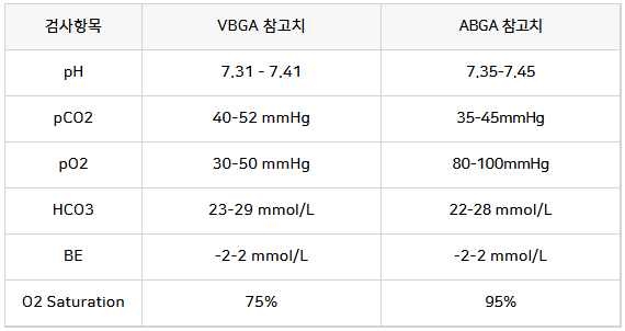 VBGA 정맥혈가스분석검사의 경우 산소 혹은 이산화탄소 분압은 크게 중점을 두지 않습니다.