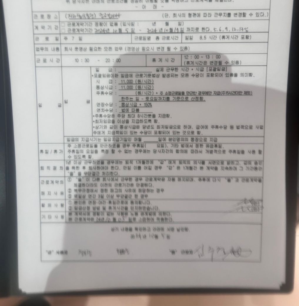 또한 근무시간이 근로계약서에 잘못표기 되어있는데