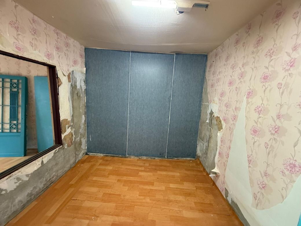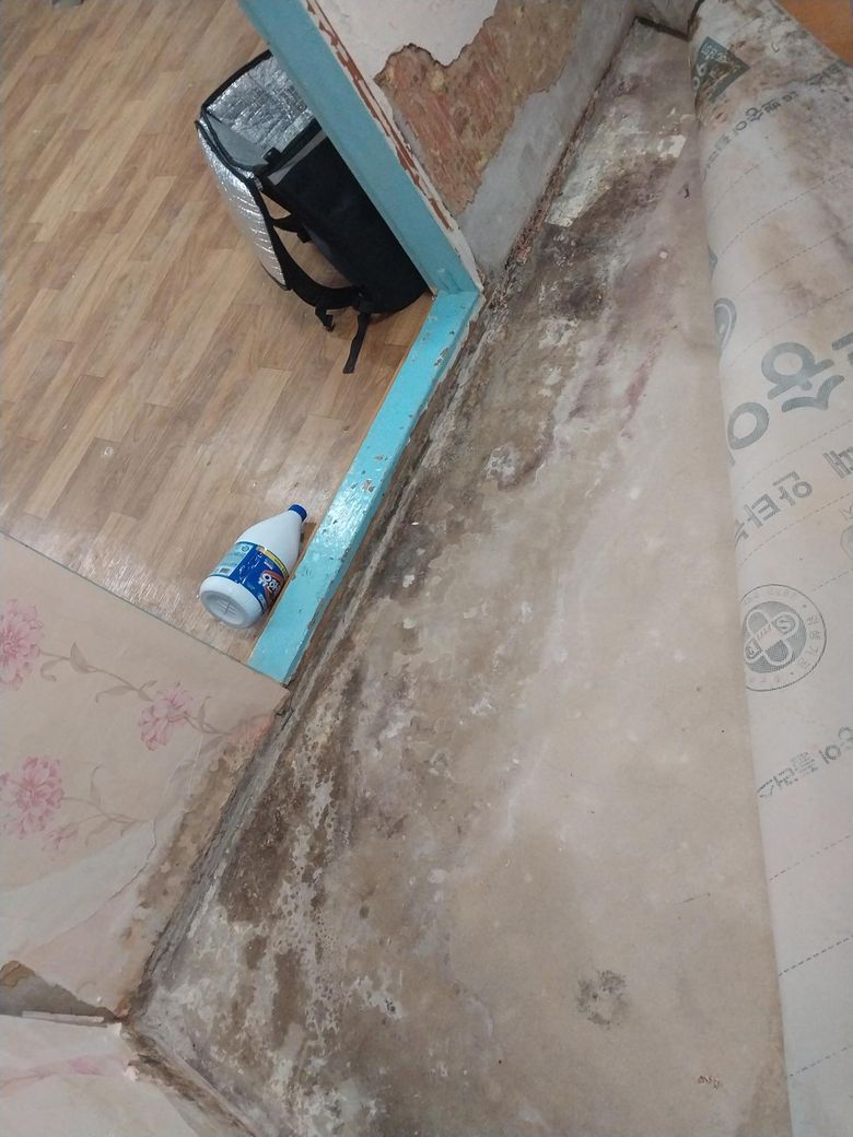 바닥(습기가 저렇게 있음 거실같은 경우는 예전 외벽에 물유입되서 벽터져서 그때 유입됬던 곳 따라 저렇게 시커멓게 습기같은게 있음 터진곳은 막았고 외벽 방수공사는 해놓은것 같음) 작은방도 바닥습기 보임