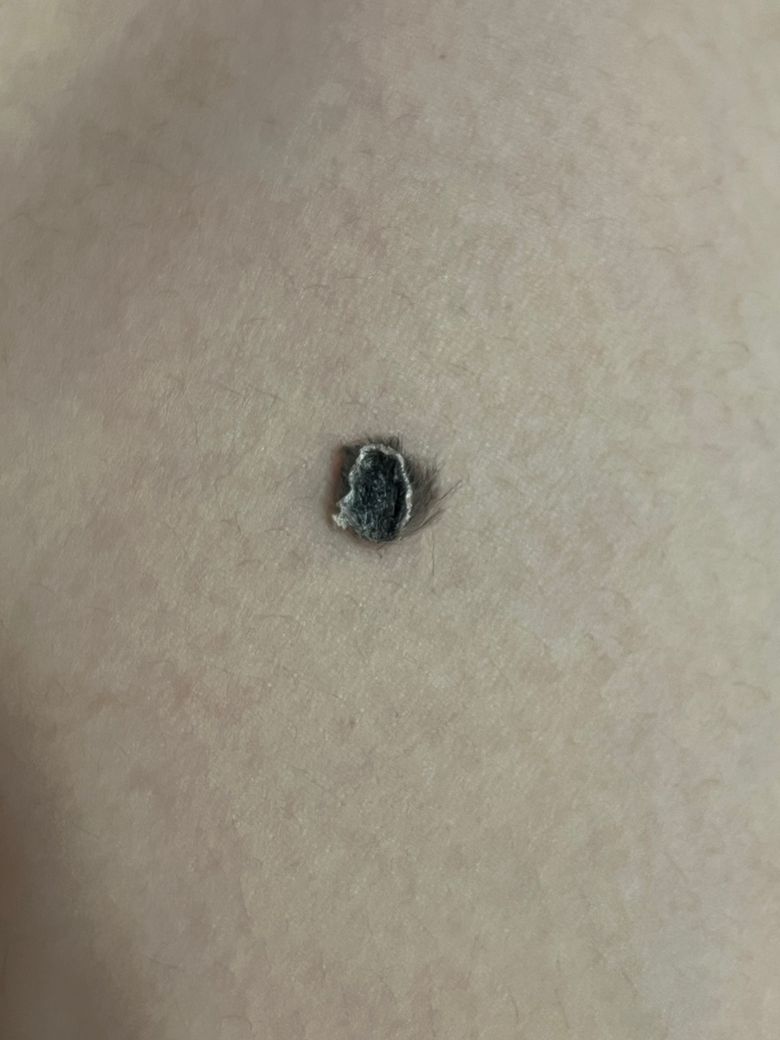 사진을 보면 중성화 부위 주변의 피부가 원형으로 떨어진 듯한 결손 부위가 확인됩니다. 현재는 출혈이나 고름 등이 없어 급성 감염으로 인한 응급 상황 가능성은 낮아 보이지만, 털만 단순히 빠진 것인지 혹은 피부층이 완전히 떨어져 피하조직까지 노출된 것인지는 사진만으로 정확히 구분하기 어렵습니다.