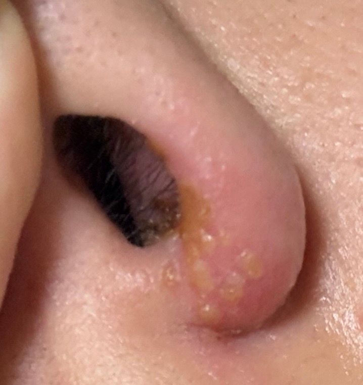 콧구멍에 이렇게 생긴 적은 없었는데 간지럽더니 물집이 잡히고 코구멍도 반대편에 비해 엄청 붓고 ㅜㅜ 자고 일어나면 코구멍 안에 진물딱지가 엄청 생겨있어요