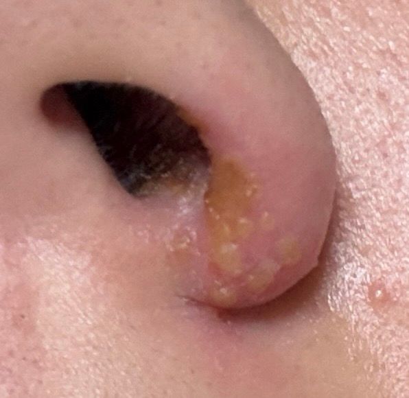 현재 상태에서는 항바이러스 치료를 빨리 시작하는 것이 회복에 도움이 되며, 코 안쪽이므로 자가 연고 사용보다는 이비인후과나 피부과 진료를 권합니다. 병변을 만지거나 딱지를 억지로 제거하는 것은 피하시는 것이 좋습니다.