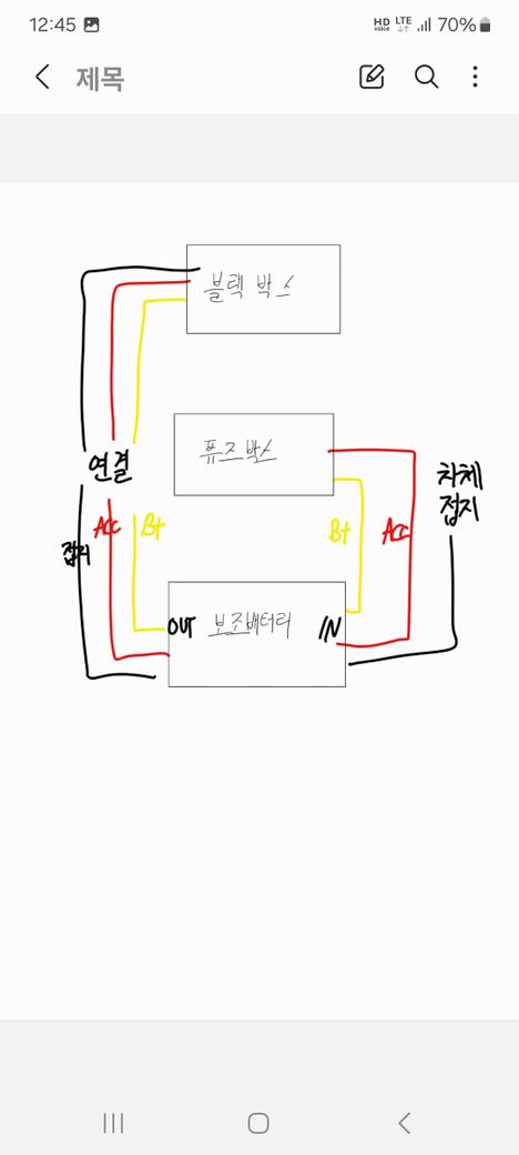 자동차 블랙박스 보조배터리를 설치하려 합니다. 블로그 유튜브 등 많은 글과 영상을 보고 이제 보조배터리를 설치하려 합니다. 아래 그림의 배선대로 하면 괜찮은지 궁금합니다.