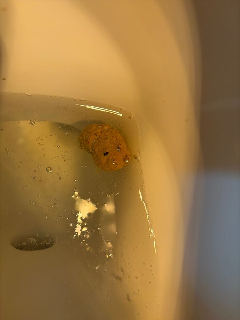 사진에서 보이는 것은 대변보다는 기침 후 배출된 객담으로 판단됩니다. 형태가 덩어리로 뭉친 점액성이고 황갈색을 띠는 점, 기침 직후 나왔다는 상황이 이에 부합합니다. 일부 검게 보이는 부분은 오래된 혈액이 섞였거나 염증성 분비물이 농축되면서 생긴 변화 가능성이 있습니다.