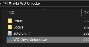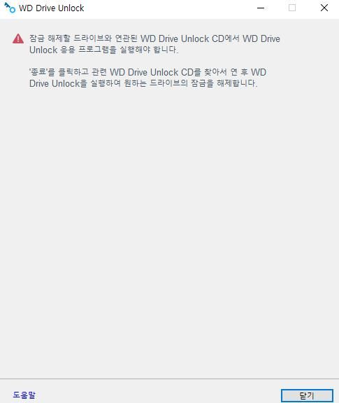 그 다음 wd drive utilities 프로그램으로 (드라이브상태확인실행하기, 빠른드라이브테스트실행하기, 전체드라이브테스트실행) 이 3가지를 모두 다 하고, (드라이브 지우기) 항목에서 박스 체크하고 드라이브 지우기를 하고 완료를 했는데요. 이후 부터 연결 후 wd drive unlock.exe 파일을 실행하면 첨부한 사진처럼(잠금 해제할 드라이브와 연관된 wd drive unlock cd에서 wd drive unlock 응용 프로그램을 실행해야 합니다 ~~~이후생략) 이런 창이 나오면서 암호 입력 창 자체가 나오질 않았습니다.