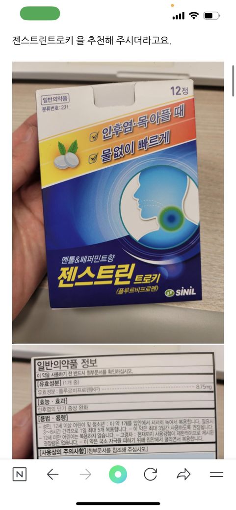 다른 증상 없이 목에 통증만 있으신거면 그냥 타이레놀을 드시는게 더 나아보이네요. 아니면 목에 뿌리는 스프레이 같은걸 사용하세요.