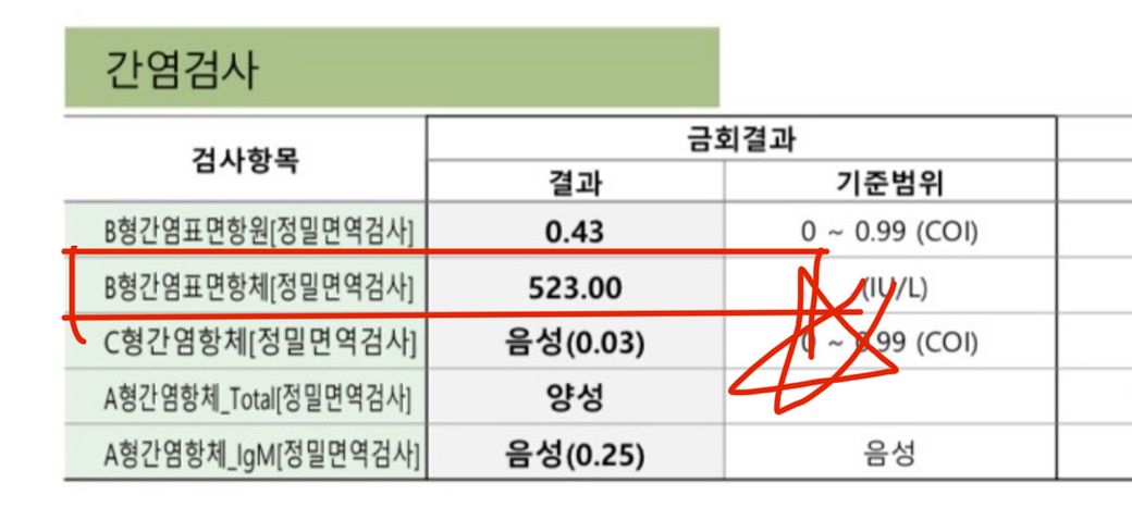 작년 간염검사 결과인데 궁금한게 있습니다. 둘째 523 수치가 높은편인데 이 수치는 뭘 의미하고 결과에 나온 수치는 어떻게 해석되나요??