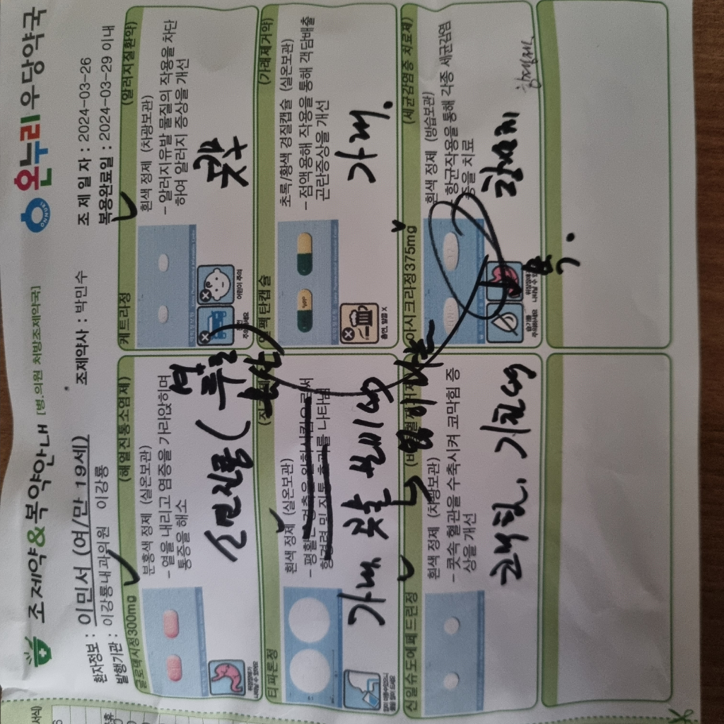 다만 처방받으신 약들 중에 항생제가 들어있으므로, 피임약에 영향을 줄 가능성이 있습니다