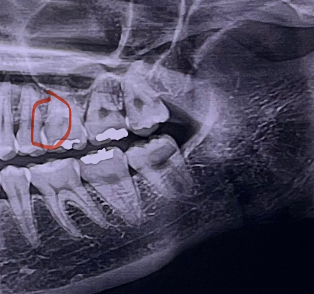 동그라미 친 부분 엑스레이상으로 봤을때 충치가 발생한걸까요? 최근 치과 검진갔을때 엑스레이 찍긴 했는데 원장님께서 따로 엑스레이는 확인을 안하셨어서 궁금합니자.