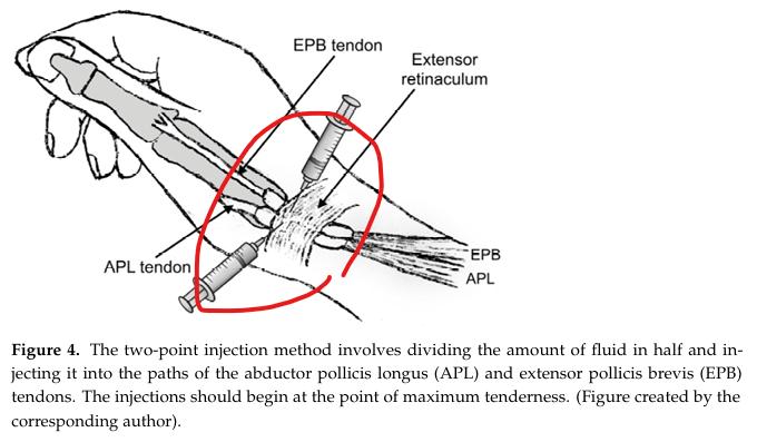 드퀘르뱅은 보통 엄지 힘줄이 지나가는 **손목 엄지 쪽(요측)**에 주사하는 것이 원칙이라, 관절만 맞았다면 효과가 적을 수 있습니다.