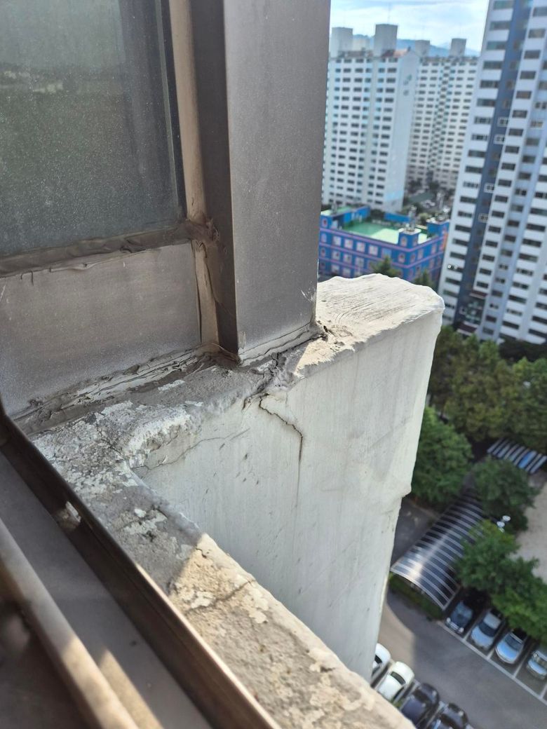 사진 속 상태를 보면 베란다 난간 고정부와 창틀 주변 콘크리트가 파손된 상황인데요.