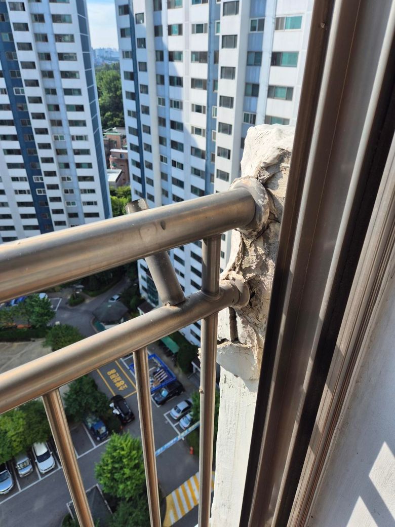즉, 현재 보이시는 부분은 단순히 세대 내부가 아니라 외벽 및 난간 구조체 손상 가능성이 높아, 원칙적으로는 관리사무소가 관여해야 할 사안이며 또한 다른세대에도 비슷한 문제가 없는지도 확인할 필요가 있어보이네요.
