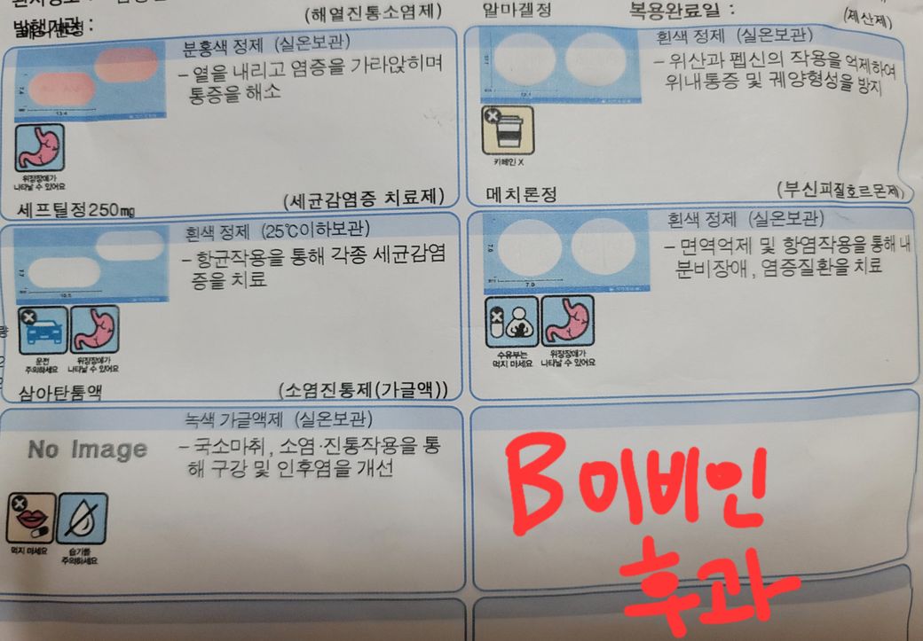 4일이 지나서 간 B이비인후과에서는 애니펜정, 세프틸정,알마겔정,메치론정을 처방해 주었습니다.