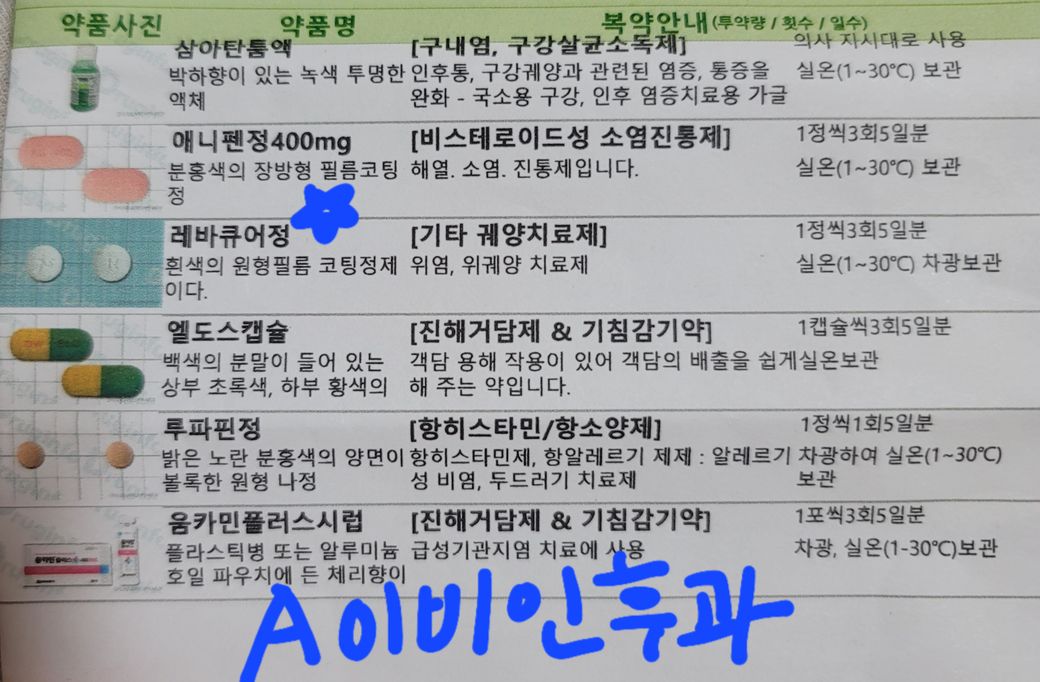 먼저 갔던 A이비인후과에서는 애니펜정, 레바큐어정 외 기타등등을 처방해주었고