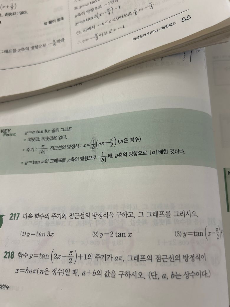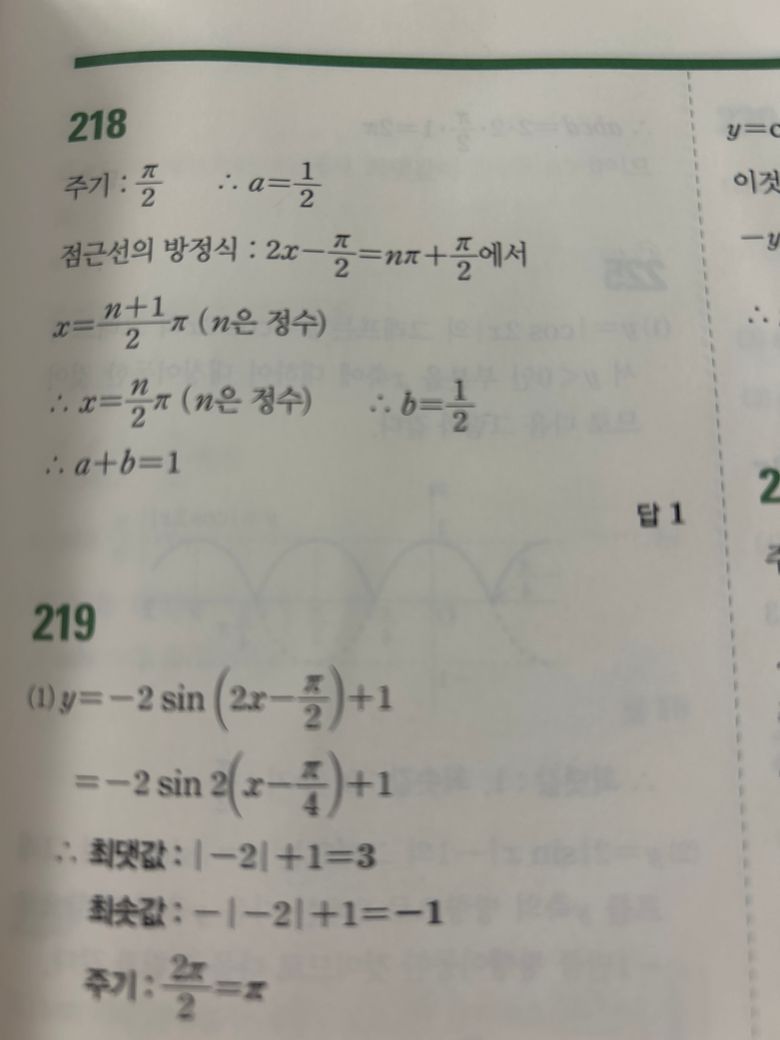 2x-ㅠ/2=nㅠ+ㅠ/2가 어디서 나온건가요..? 점근선 방정식은 1/b(nㅠ+1/2ㅠ) 하는 거 잖아요? 근데 여기서 x축으로 ㅠ/2만큼 움직였으니까 1/b(nㅠ+1/2ㅠ) + ㅠ/2 하면 점근선 방정식 아닌가요