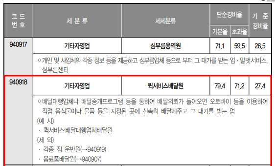 도보배달 업종코드와 소득금액 산정