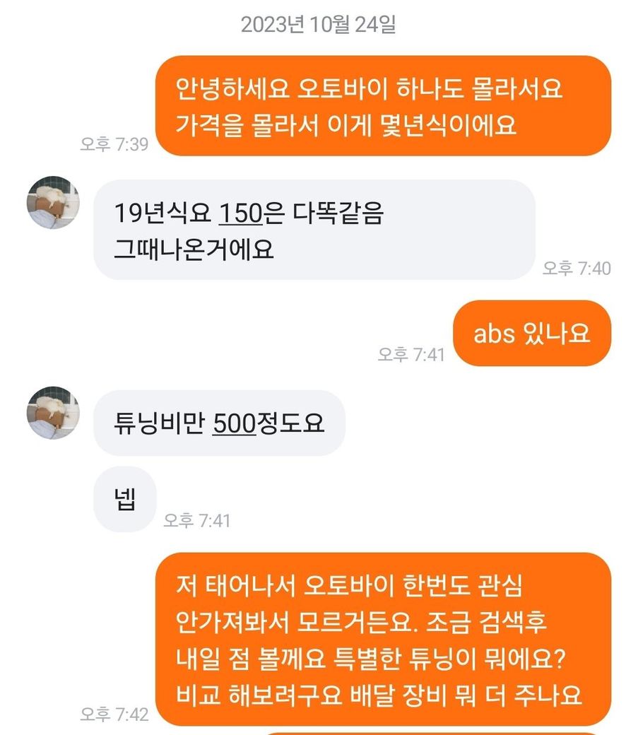 오토바이 물어봤는데 19년식이 튜닝비 500 들어갔다고 해서 관심 갖게 되었습니다.