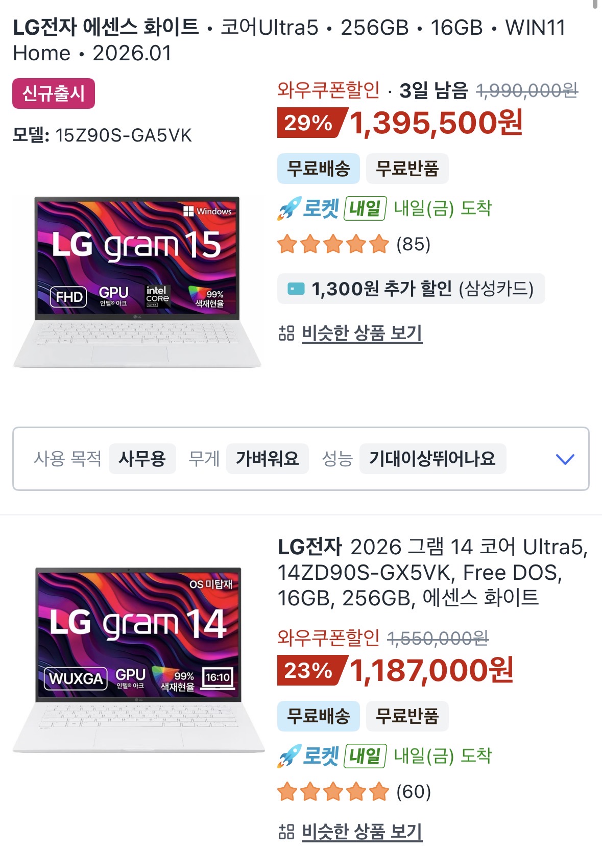 삼성 갤럭시북 엘지 그램 가성비는 150정도는 줘야 쓸만한 모델을 구매가능합니다. (2년전 최신모델)