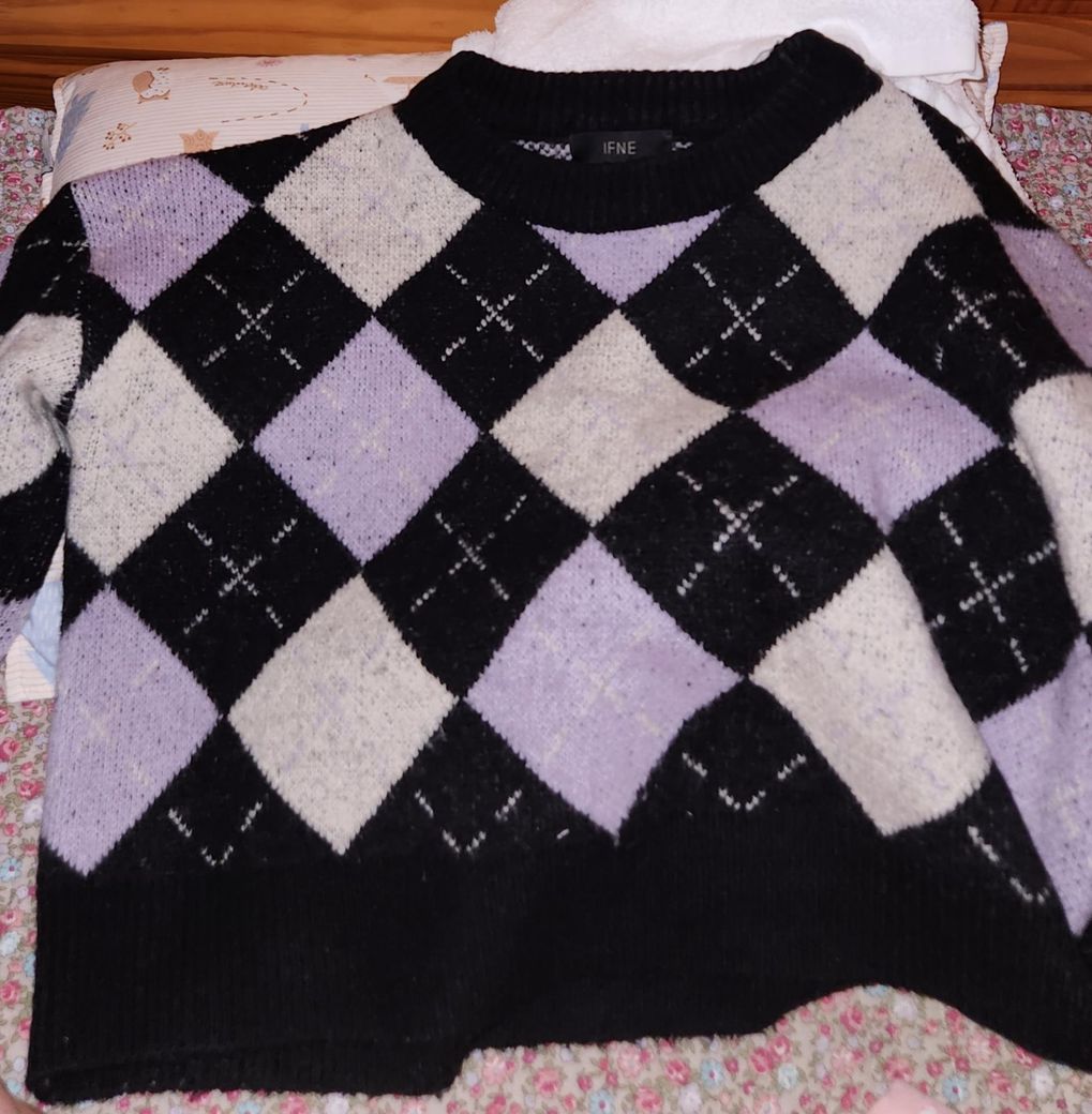 사진속 니트는 보라, 흰, 검정 아가일 패턴이라 클래식하면서도 부드러운 인상입니다. 연청(워싱된 밝은 청)이나 중청의 청바지가 가장 잘 어울릴거 같습니다. 색 대비가 부드럽고 니트의 보라색을 살려주거든요. 다른 하의로는 블랙슬랙스가 깔끔합니다. 신발은 흰 운동화나 블랙로퍼가 좋을듯 합니다.