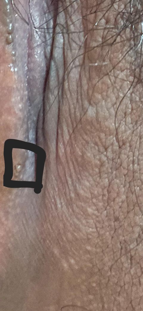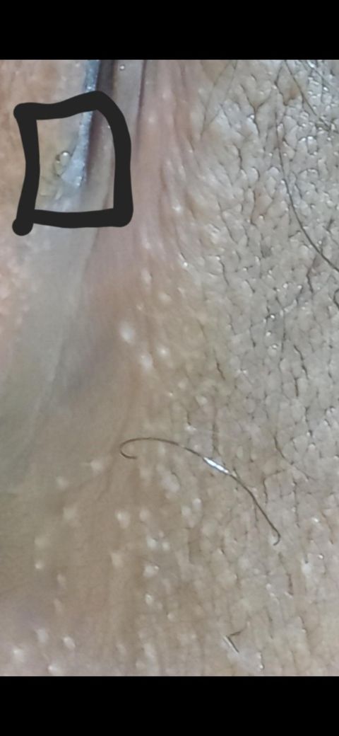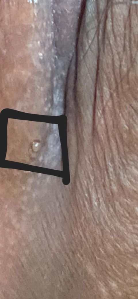 사진상 병변은 단일의 작고 둥근 구진으로 보이며, 표면이 비교적 매끈하고 중심에 약간의 함몰 또는 하얀 내용물이 있는 형태에 가깝습니다. 전형적인 헤르페스 2형은 통증을 동반한 여러 개의 군집 수포가 먼저 생기고, 이후 궤양으로 진행하는 양상이 흔합니다. 단일 병변, 통증 없음, 물집이 아닌 고형 구진 형태라면 전형적 생식기 헤르페스와는 다소 다릅니다.