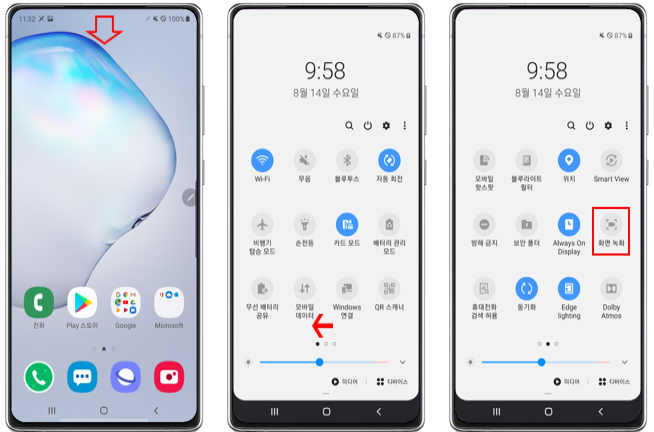 스마트폰 상단바를 아래로 내린 후 알림창을 왼쪽으로 밀어보시면 화면 녹화라는 것이 있습니다.