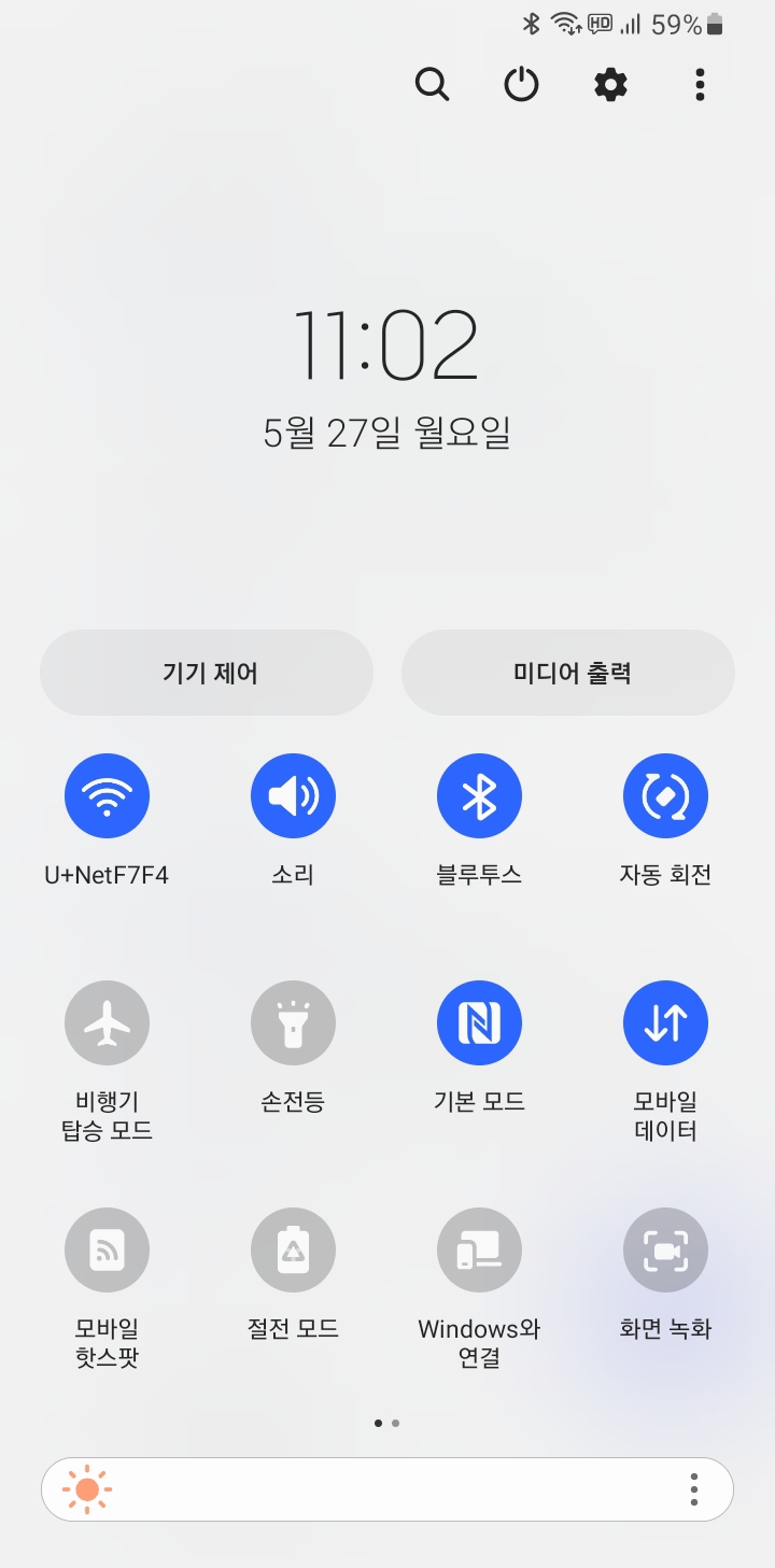 갤럭시 스마트폰 상단부분을 손으로 드래그하여 내리면 와이파이, 소리, 블루투스 등 설정 화면이 나옵니다.