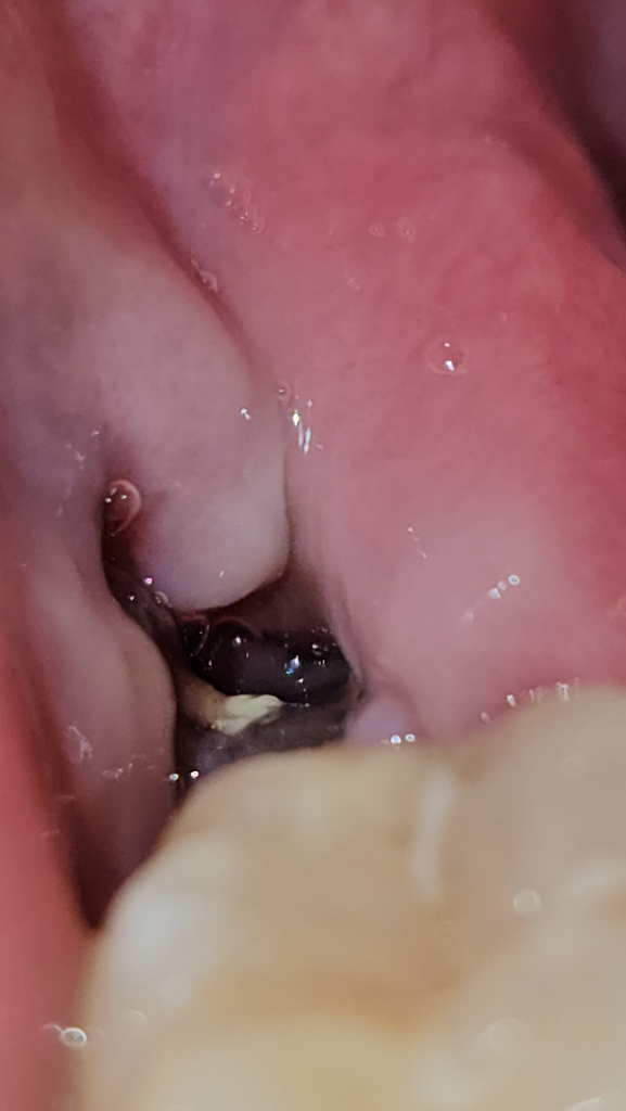 현재 해당부위에 혈병형성으로 하얀색으로 보이며, 상처가 아무는 과정이기에 건들지 말고 그대로 두길 권합니다.