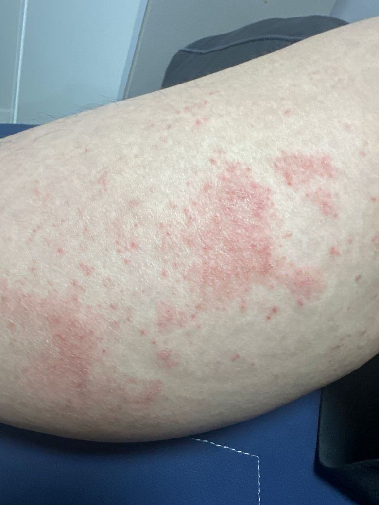 현재 병변 모양으로 보아서는 알레르기 반응으로 인해 나타난 두드러기 양상으로, 특정 물체에 접촉을 오래하여 생긴 접촉성 피부염도 배제할 수 없습니다. 우선 원인을 정확히 아는 것이 중요하기 때문에 당장 피부에 약을 도포하기 보다는 피부과에 방문하셔서 의사의 진료를 받아보시는 것이 좋을 것으로 사료됩니다.