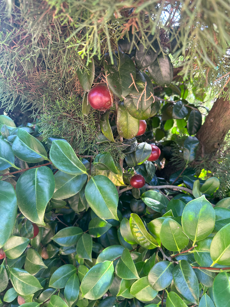 나뭇잎과 열매모양과 색깔을 보니 동백나무의 일종인것 같습니다. 요즘에 조금씩 동백나무가 열매를 맺고 있고 동백나무 씨앗으로 기름을 짜서 먹기도 합니다.