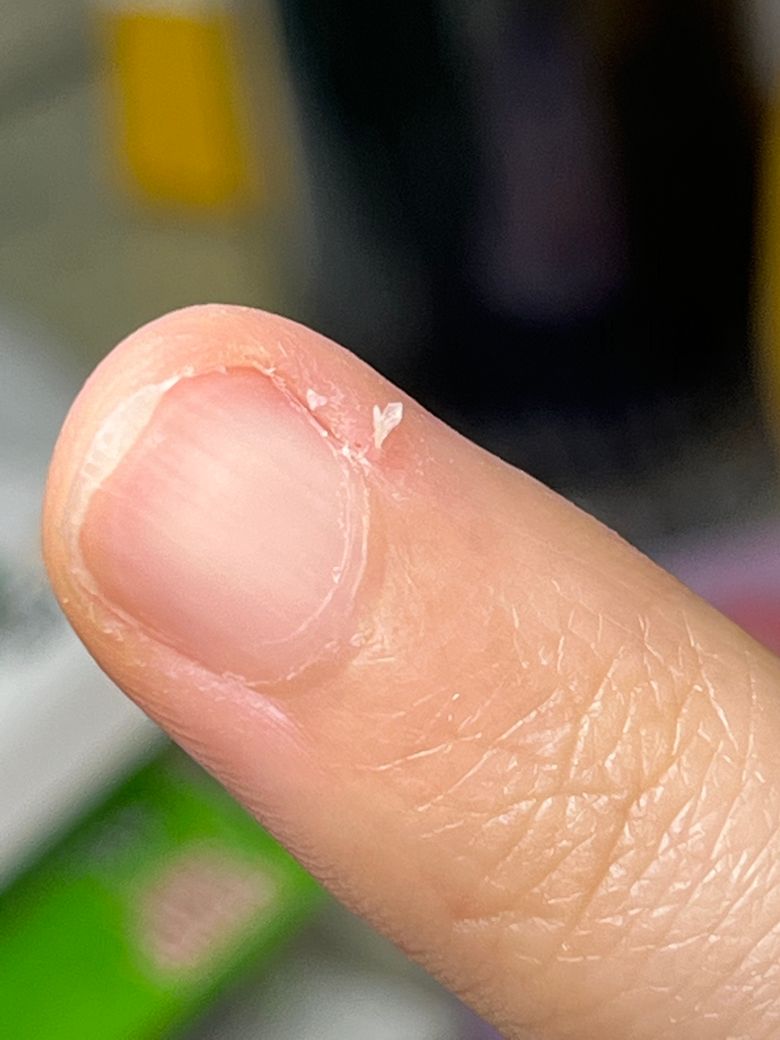 손톱 옆의 병변을 말씀하시는 거라면 피부가 벗겨지면서 작은 혈관이 노출되어 혈전을 형성한 모습으로 의심되니 며칠 기다려보시기 바랍니다.