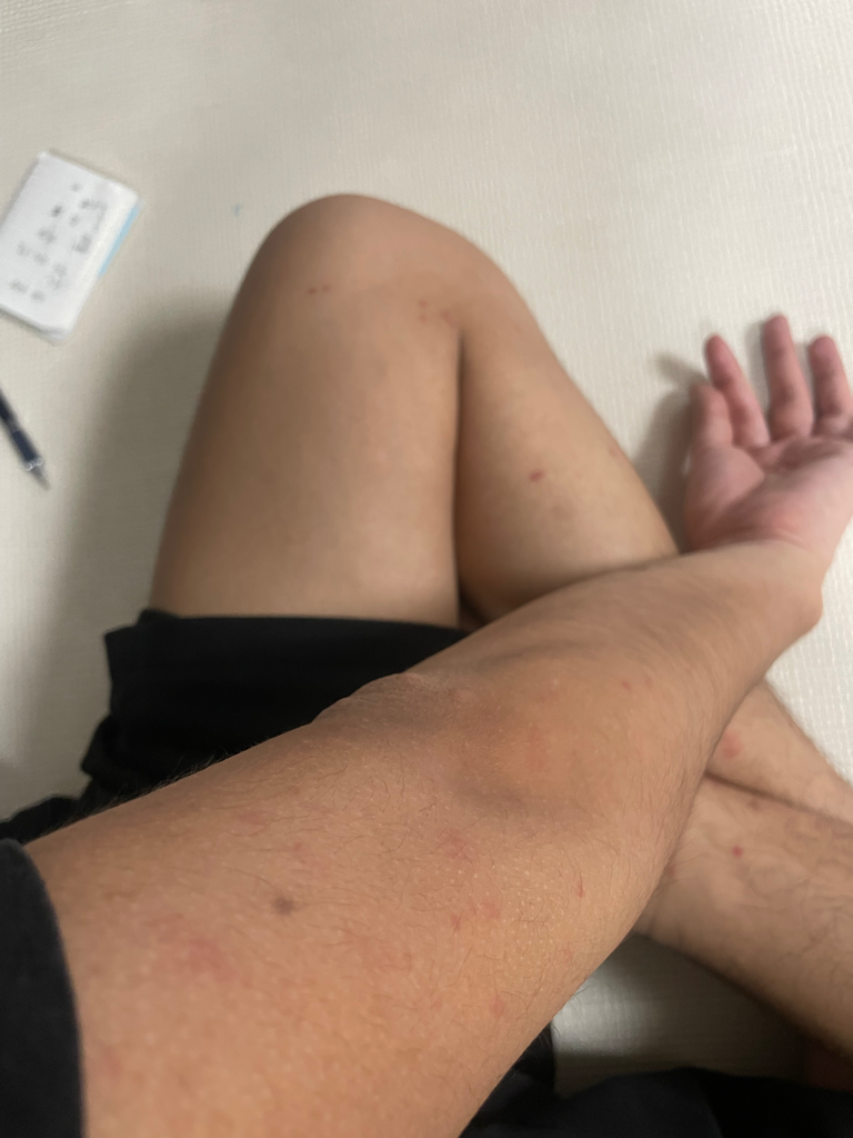원인까지 알긴 어려우나 가려움증이 심하다면 찬 물수건을 이용한 냉찜질과 약국에서 항히스타민제를 구입하여 복용하시고 내일 피부과 진료를 권합니다.