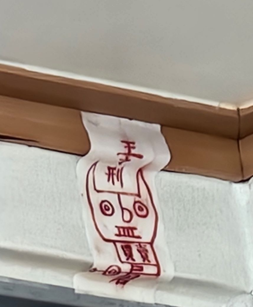 이번에 이사가는 집 현관문 위에 붙어있는 부적인데 제가 알고있는 복들어오는 부적이나 그런종류가 아닌거같은데 어떤 부적인지 알수있을까요?