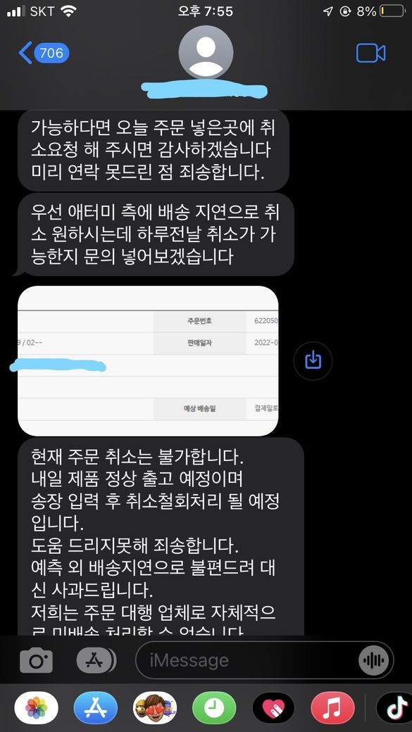 오늘 오후 6:32분경 대행업체측에서 배송취소 불가한다고 문자가왔습니다