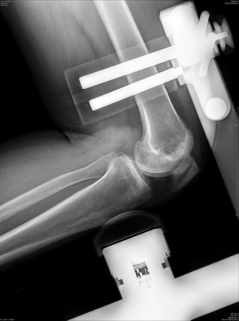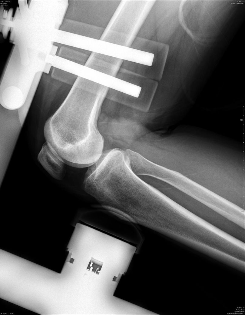 이 X-ray는 뼈 정렬·고정물 위치만 볼 수 있어, “무릎 동요도(십자인대 안정성)”는 판단할 수 없습니다.