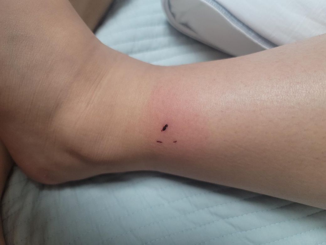 작은 뒷산에서 아주 얕은 구덩이같은곳에서 덤불같은걸 밟으며 긁힌것같다는데 피딱지주변에 붉은데 열감도 좀 느껴지고