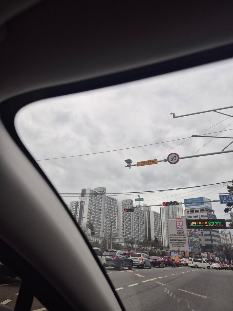 차가 너무 밀려서 딱 빨간불되면서 저기에 멈춰섰는데여.