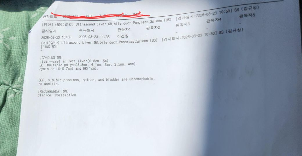 초음파 결과를 보면 간 좌엽에 0.8cm 낭종, 담낭에는 약 3에서 4mm 크기의 용종이 여러 개, 양측 신장에 작은 낭종이 관찰됩니다. 담관, 췌장, 비장 등은 특이 소견 없습니다.