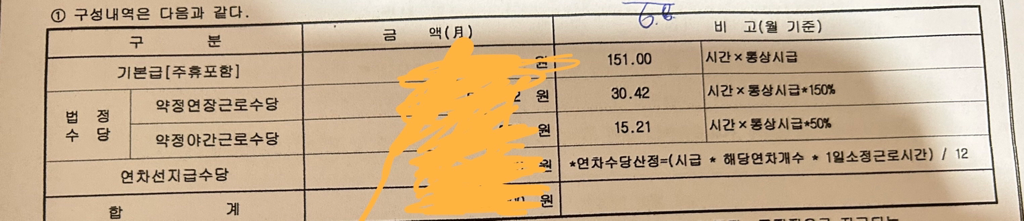 1. 구체적인 사실관계를 알 수 없어 명확한 답변을 드리기 어려우나 상기 근로계약서상 기본급은 주휴시간을 포함한 월 151시간이며, 야간근로수당이 포함된 것으로 보아 오후 10시부터 다음 날 오전 6시 사이의 근로가 예정되어 있는 것으로 보이며, 1주 40시간을 초과하는 근로는 발생하지 않으나 단시간 근로자로서 1일 소정근로시간을 초과하는 연장근로에 대한 수당을 미리 월급여에 포함시킨 것으로 볼 수 있습니다.