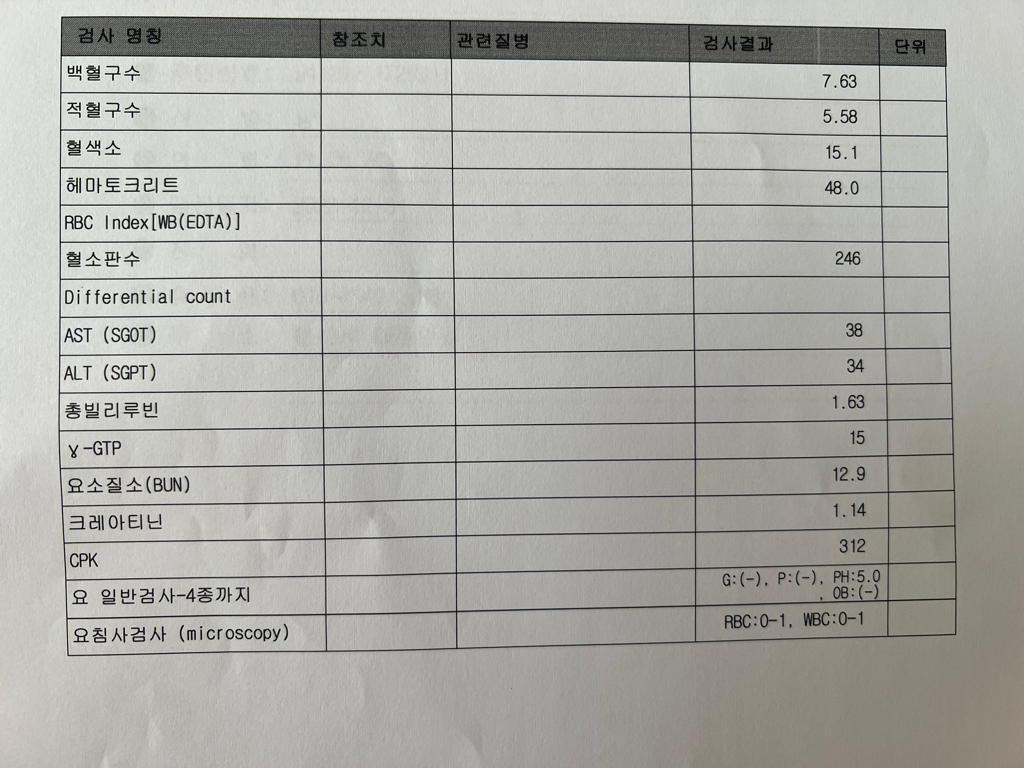 피검사와 소변검사는 갈색소변을 보고 난뒤 3시간 정도 뒤에 실시했습니다