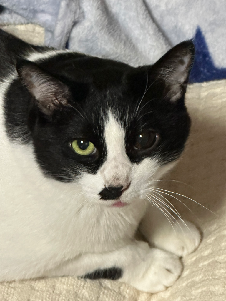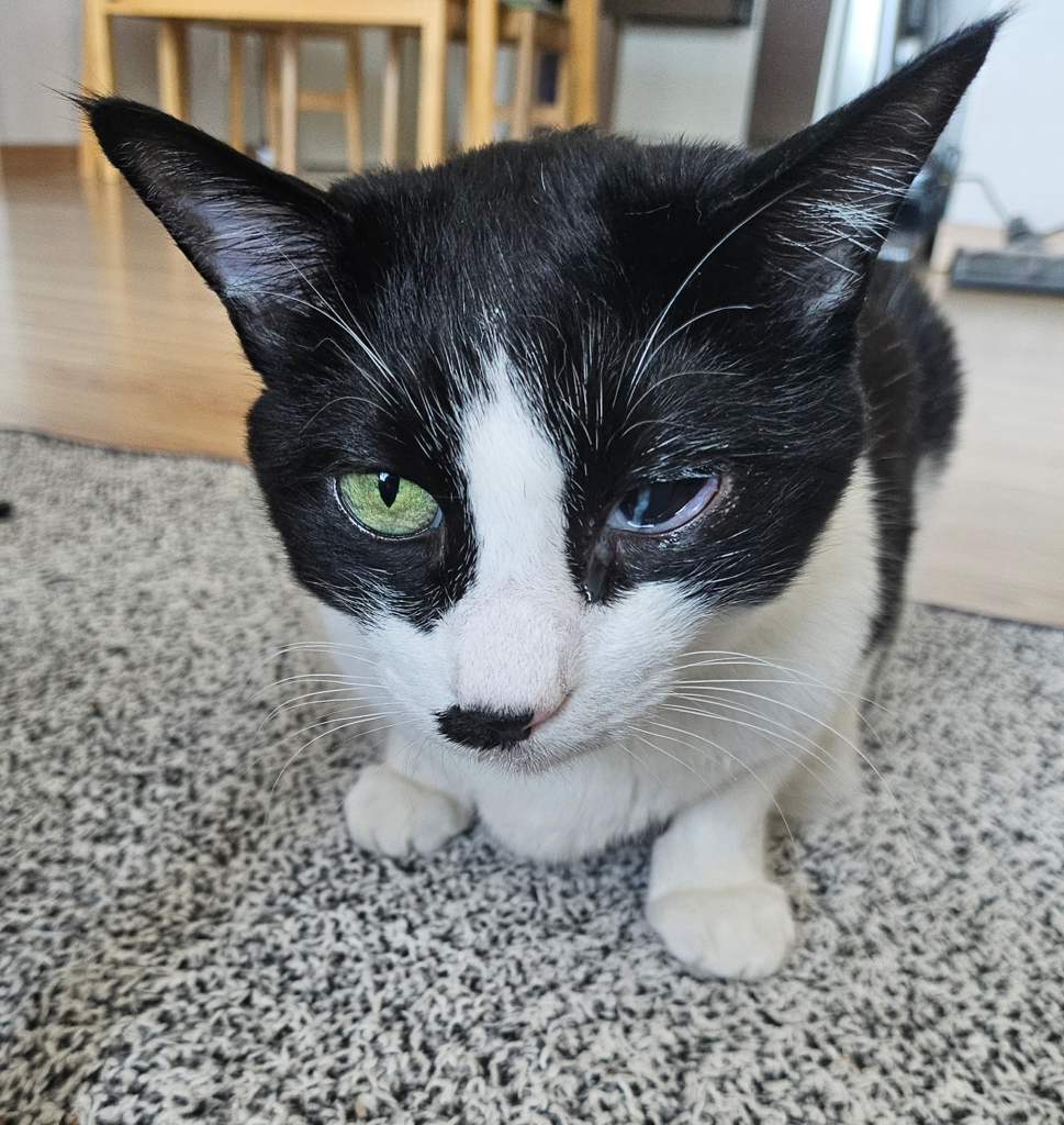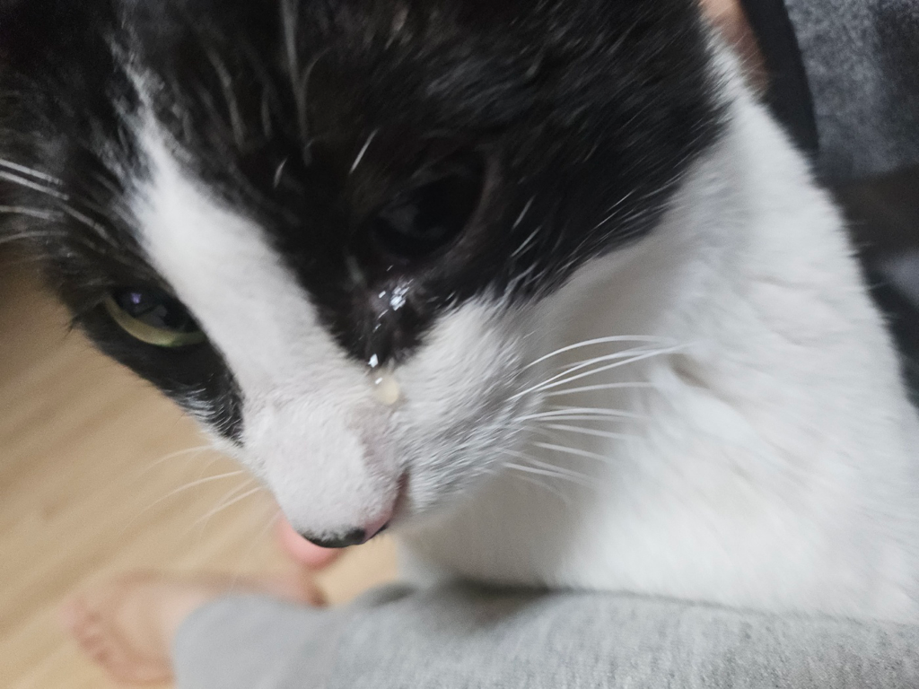 동공이 완전히 개방되어있고 길냥이 출신인점, 전신 증상이 나타나고 있는점을고려할때 안내염이나 기타 뇌로의 염증 파급 가능성이 매우 높습니다.